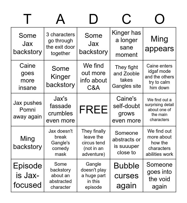 This bingo card has a free space and 24 words: Jax doesn't break Gangle's comedy mask, Some backstory about an abstracted character, We find out more info about C&A, Episode is Jax-focused, Ming appears, Some Jax backstory, Caine goes more insane, 3 characters go through the exit door together, Caine's self-doubt grows even more, They finally leave the circus tend (not in an adventure), They fight and Zooble takes Gangles site, Jax pushes Pomni away again, Someone abstracts or is suuuper close to, We find out more about how the characters abilities work, Some Kinger backstory, Bubble curses again, We find out a surprising detail about one of the main characters, Some Jax backstory, Caine enters idgaf mode and the others try to calm him down, Jax's fassade crumbles even more, Someone goes into the void again, Ming backstory, Kinger has a longer sane moment and Gangle doesn't play a huge part in this episode.