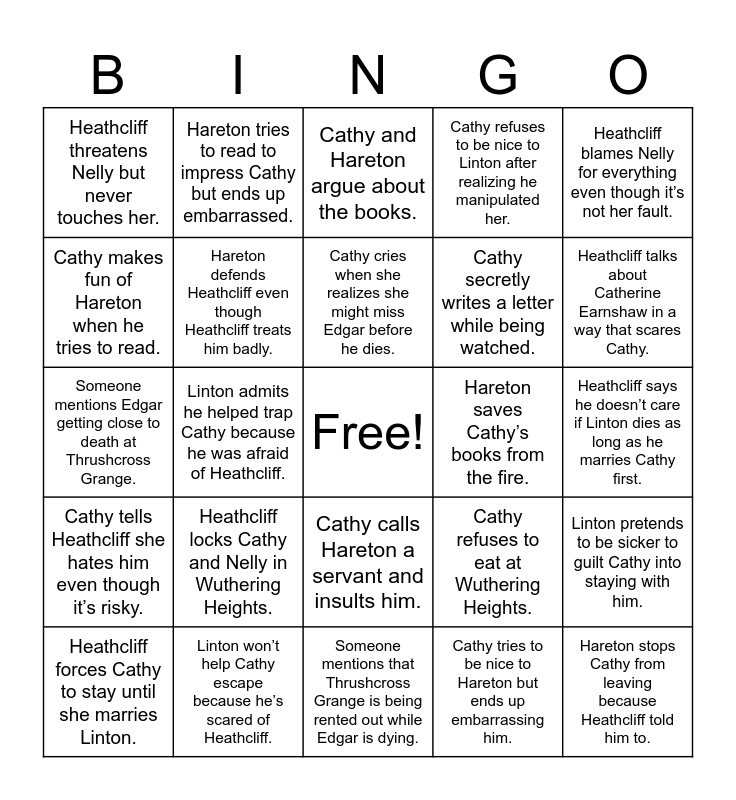 This bingo card has a free space and 24 words: Heathcliff locks Cathy and Nelly in Wuthering Heights., Linton won’t help Cathy escape because he’s scared of Heathcliff., Cathy cries when she realizes she might miss Edgar before he dies., Heathcliff forces Cathy to stay until she marries Linton., Heathcliff blames Nelly for everything even though it’s not her fault., Heathcliff threatens Nelly but never touches her., Cathy makes fun of Hareton when he tries to read., Hareton tries to read to impress Cathy but ends up embarrassed., Hareton saves Cathy’s books from the fire., Cathy calls Hareton a servant and insults him., Cathy secretly writes a letter while being watched., Someone mentions Edgar getting close to death at Thrushcross Grange., Cathy refuses to eat at Wuthering Heights., Linton pretends to be sicker to guilt Cathy into staying with him., Hareton defends Heathcliff even though Heathcliff treats him badly., Cathy tries to be nice to Hareton but ends up embarrassing him., Heathcliff says he doesn’t care if Linton dies as long as he marries Cathy first., Cathy and Hareton argue about the books., Heathcliff talks about Catherine Earnshaw in a way that scares Cathy., Linton admits he helped trap Cathy because he was afraid of Heathcliff., Hareton stops Cathy from leaving because Heathcliff told him to., Cathy tells Heathcliff she hates him even though it’s risky., Cathy refuses to be nice to Linton after realizing he manipulated her. and Someone mentions that Thrushcross Grange is being rented out while Edgar is dying..