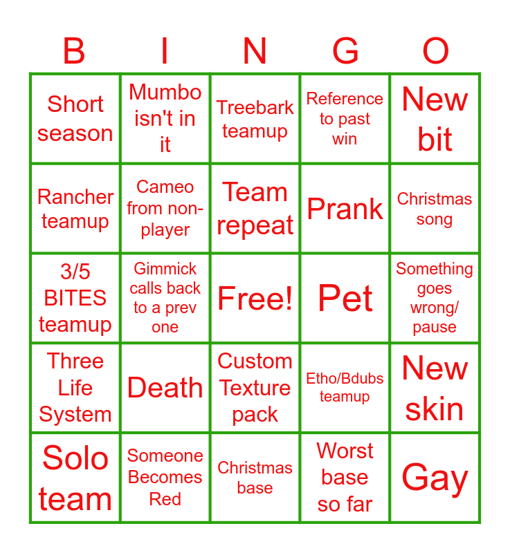 This bingo card has a free space and 24 words: Death, Someone Becomes Red, Team repeat, Solo team, New bit, Short season, Rancher teamup, Mumbo isn't in it, Pet, Custom Texture pack, Prank, 3/5 BITES teamup, Etho/Bdubs teamup, New skin, Cameo from non-player, Worst base so far, Something goes wrong/ pause, Treebark teamup, Christmas song, Gimmick calls back to a prev one, Gay, Three Life System, Reference to past win and Christmas base.