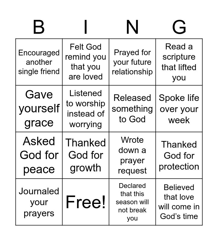 This bingo card has 16 words: Free!, Thanked God for protection, Prayed for your future relationship, Encouraged another single friend, Asked God for peace, Felt God remind you that you are loved, Wrote down a prayer request, Declared that this season will not break you, Gave yourself grace, Listened to worship instead of worrying, Journaled your prayers, Read a scripture that lifted you, Thanked God for growth, Spoke life over your week, Released something to God and Believed that love will come in God’s time.