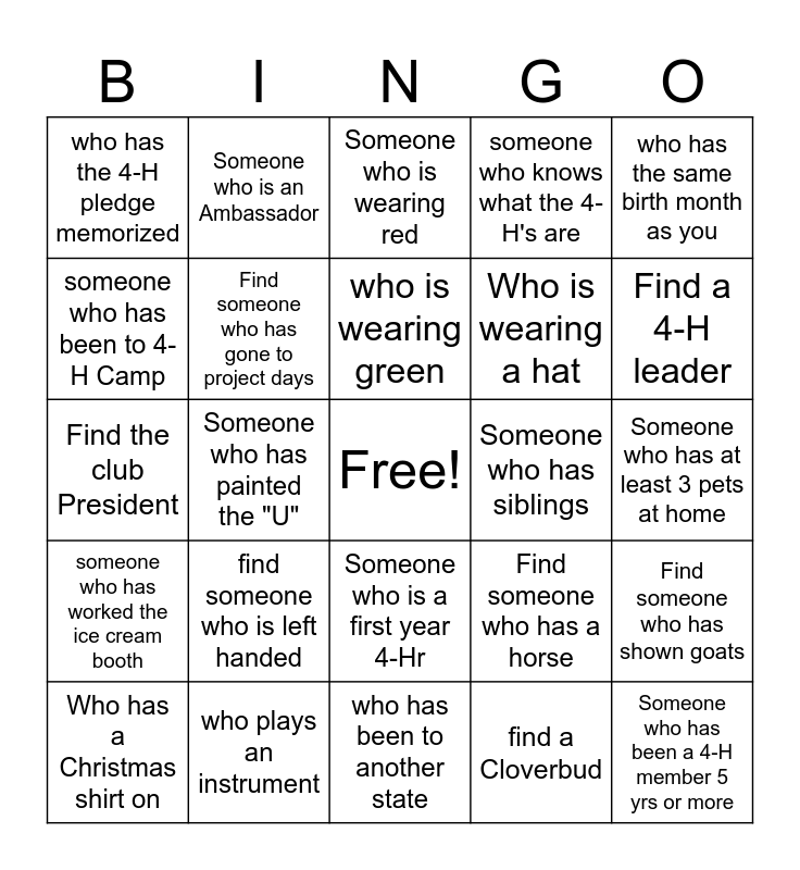 This bingo card has a free space and 24 words: find someone who is left handed, who plays an instrument, who is wearing green, Who has a Christmas shirt on, who has the same birth month as you, who has the 4-H pledge memorized, someone who has been to 4-H Camp, Someone who is an Ambassador, Someone who has siblings, Someone who is a first year 4-Hr, Who is wearing a hat, Find the club President, Find someone who has a horse, Find someone who has shown goats, Find someone who has gone to project days, find a Cloverbud, Someone who has at least 3 pets at home, Someone who is wearing red, Find a 4-H leader, Someone who has painted the "U", Someone who has been a 4-H member 5 yrs or more, someone who has worked the ice cream booth, someone who knows what the 4-H's are and who has been to another state.