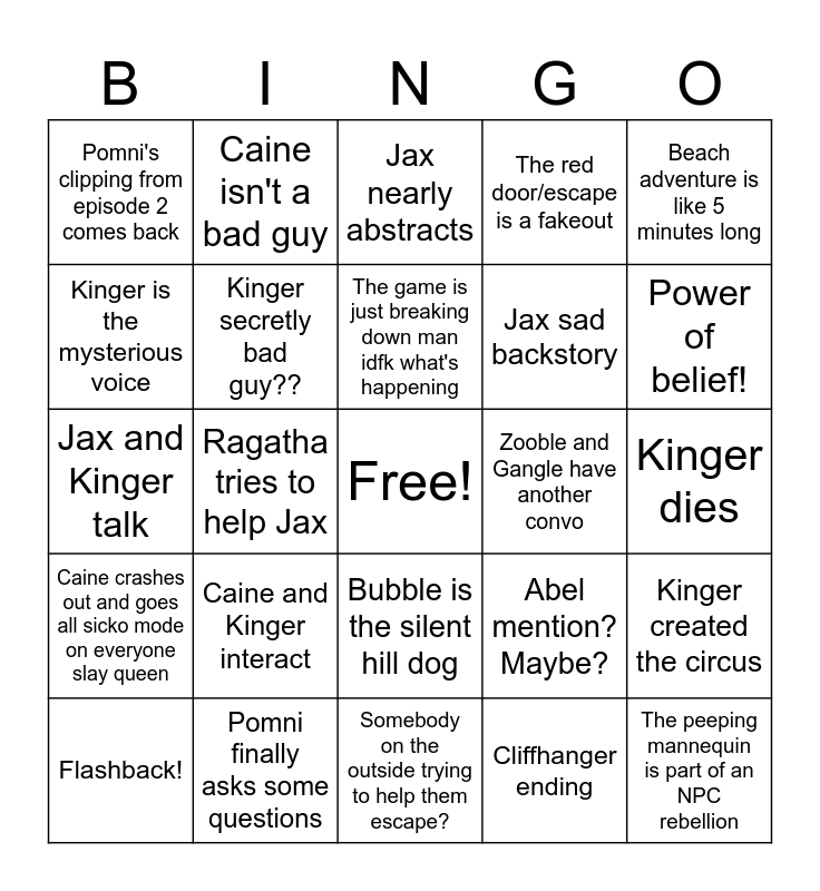 This bingo card has a free space and 24 words: Caine and Kinger interact, Pomni finally asks some questions, The game is just breaking down man idfk what's happening, Flashback!, Beach adventure is like 5 minutes long, Pomni's clipping from episode 2 comes back, Kinger is the mysterious voice, Caine isn't a bad guy, Zooble and Gangle have another convo, Bubble is the silent hill dog, Jax sad backstory, Jax and Kinger talk, Abel mention? Maybe?, Kinger created the circus, Kinger secretly bad guy??, Cliffhanger ending, Kinger dies, Jax nearly abstracts, Power of belief!, Ragatha tries to help Jax, The peeping mannequin is part of an NPC rebellion, Caine crashes out and goes all sicko mode on everyone slay queen, The red door/escape is a fakeout and Somebody on the outside trying to help them escape?.