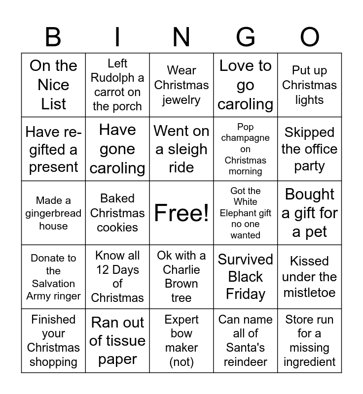 This bingo card has a free space and 45 words: Hung up a Christmas stocking, Store run for a missing ingredient, Feel sorry for the Grinch, Finished your Christmas shopping, Waited up for Santa, Can name all of Santa's reindeer, Wear Christmas jewelry, Like fruitcake, Put up Christmas lights, Ran out of tissue paper, Love to go caroling, Got the White Elephant gift no one wanted, Ok with a Charlie Brown tree, Know all 12 Days of Christmas, Own a Christmas sweater, Expert bow maker (not), Date with a turkey on the 25th, Made a gingerbread house, Hung a Christmas wreath, Skipped the office party, Left Rudolph a carrot on the porch, Went to The Nutcracker, Bought your gifts online, On the Nice List, Love hot chocolate, Bought a gift for a pet, On the Naughty List, Have a December birthday, Survived Black Friday, Donate to the Salvation Army ringer, Drove around to see the lights, Kissed under the mistletoe, Made a snowman, Gave coal to an in-law, Eggnog with rum, Baked Christmas cookies, Feel more like Scrooge every year, Watched Christmas Vacation, Peeked at hidden gifts, Went on a sleigh ride, Have re-gifted a present, Pop champagne on Christmas morning, Couldn't find a parking place, Have gone caroling and Love Hallmark Christmas movies.