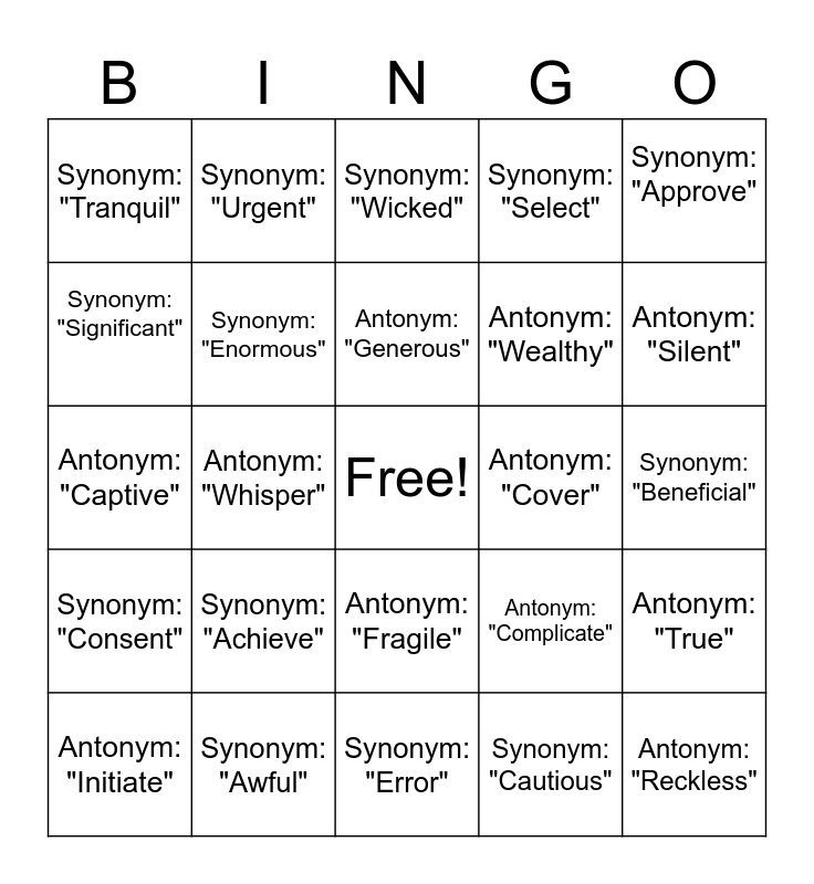 This bingo card has a free space and 24 words: Synonym: "Achieve", Synonym: "Awful", Antonym: "Generous", Antonym: "Initiate", Synonym: "Approve", Synonym: "Tranquil", Synonym: "Significant", Synonym: "Urgent", Antonym: "Cover", Antonym: "Fragile", Antonym: "Wealthy", Antonym: "Captive", Antonym: "Complicate", Antonym: "True", Synonym: "Enormous", Synonym: "Cautious", Synonym: "Beneficial", Synonym: "Wicked", Antonym: "Silent", Antonym: "Whisper", Antonym: "Reckless", Synonym: "Consent", Synonym: "Select" and Synonym: "Error".