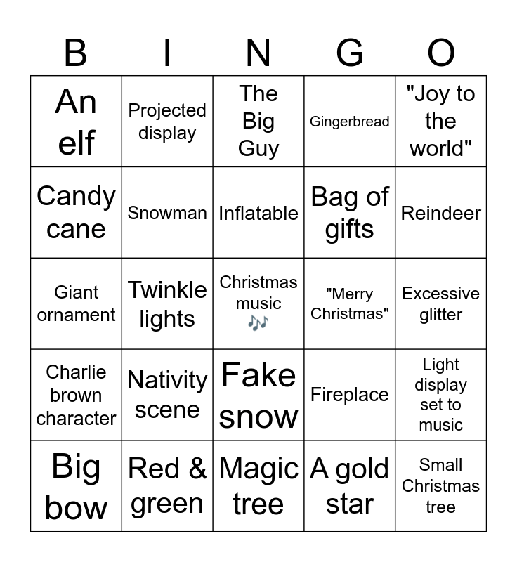 This bingo card has a free space and 24 words: Nativity scene, Red & green, Inflatable, Big bow, "Joy to the world", An elf, Candy cane, Projected display, "Merry Christmas", Fake snow, Bag of gifts, Giant ornament, Fireplace, Light display set to music, Snowman, A gold star, Excessive glitter, The Big Guy, Reindeer, Twinkle lights, Small Christmas tree, Charlie brown character, Gingerbread and Magic tree.