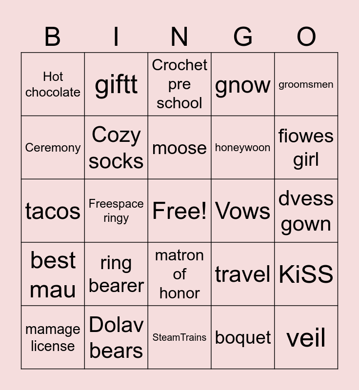This bingo card has a free space and 31 words: SteamTrains, Peonies, Freespace ringy, Dr. Repper, Hot chocolate, Crochet pre school, Cozy socks, travel, Vows, boquet, dvess gown, veil, bride, groom, fiowes girl, reception, KiSS, ring bearer, best mau, matron of honor, groomsmen, bridesmaid8, mamage license, giftt, honeywoon, Ceremony, gnow, tacos, Dolav bears, moose and OHters.