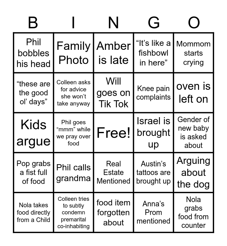 This bingo card has a free space and 24 words: Phil calls grandma, Colleen tries to subtly condemn premarital co-inhabiting, Will goes on Tik Tok, Nola takes food directly from a Child, Mommom starts crying, Phil bobbles his head, “these are the good ol’ days”, Family Photo, Israel is brought up, Real Estate Mentioned, Knee pain complaints, Kids argue, Austin’s tattoos are brought up, Arguing about the dog, Colleen asks for advice she won’t take anyway, Anna’s Prom mentioned, Gender of new baby is asked about, Amber is late, oven is left on, Phil goes “mmm” while we pray over food, Nola grabs food from counter, Pop grabs a fist full of food, “It’s like a fishbowl in here” and food item forgotten about.