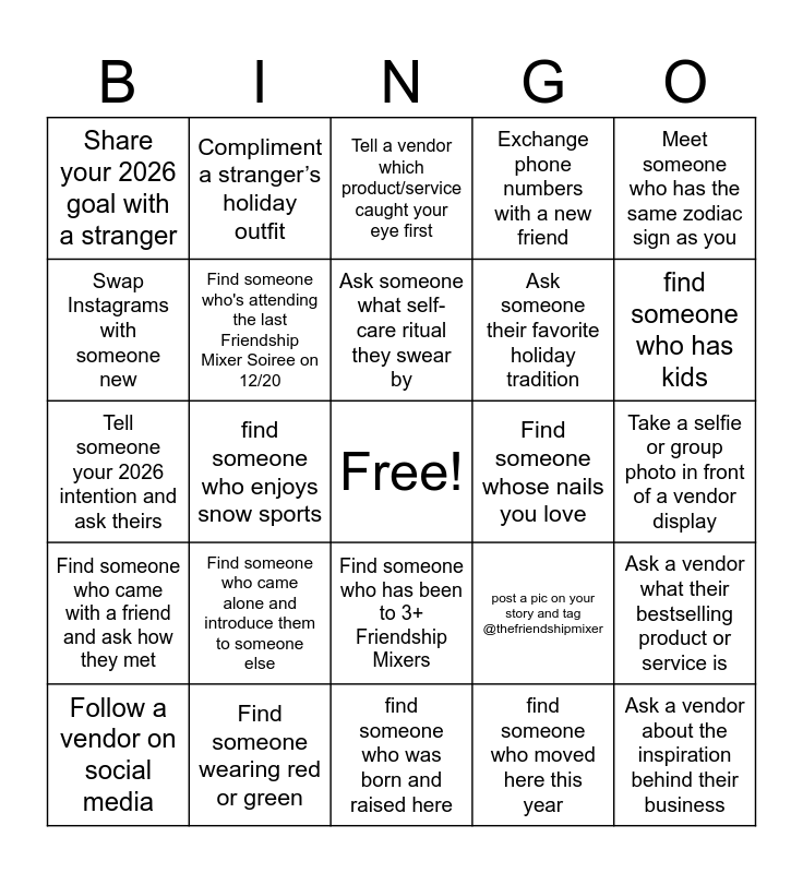 This bingo card has a free space and 24 words: Find someone who came alone and introduce them to someone else, Find someone wearing red or green, Ask someone what self-care ritual they swear by, Follow a vendor on social media, Meet someone who has the same zodiac sign as you, Share your 2026 goal with a stranger, Swap Instagrams with someone new, Compliment a stranger’s holiday outfit, Find someone whose nails you love, Find someone who has been to 3+ Friendship Mixers, Ask someone their favorite holiday tradition, Tell someone your 2026 intention and ask theirs, post a pic on your story and tag @thefriendshipmixer, Ask a vendor what their bestselling product or service is, Find someone who's attending the last Friendship Mixer Soiree on 12/20, find someone who moved here this year, Take a selfie or group photo in front of a vendor display, Tell a vendor which product/service caught your eye first, find someone who has kids, find someone who enjoys snow sports, Ask a vendor about the inspiration behind their business, Find someone who came with a friend and ask how they met, Exchange phone numbers with a new friend and find someone who was born and raised here.