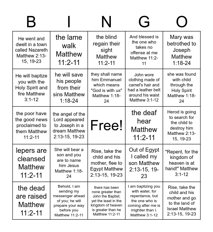This bingo card has a free space and 28 words: "Repent, for the kingdom of heaven is at hand!" Matthew 3:1-12, Prepare the way of the Lord, make straight his paths Matthew 3:1-12, John wore clothing made of camel's hair and had a leather belt around his waist Matthew 3:1-12, I am baptizing you with water, for repentance, but the one who is coming after me is mightier than I. Matthew 3:1-12, He will baptize you with the Holy Spirit and fire Matthew 3:1-12, the blind regain their sight Matthew 11:2-11, the lame walk Matthew 11:2-11, lepers are cleansed Matthew 11:2-11, the deaf hear Matthew 11:2-11, the dead are raised Matthew 11:2-11, the poor have the good news proclaimed to them Matthew 11:2-11, And blessed is the one who takes no offense at me Matthew 11:2-11, Behold, I am sending my messenger ahead of you; he will prepare your way before you Matthew 11:2-11, there has been none greater than John the Baptist; yet the least in the kingdom of heaven is greater than he Matthew 11:2-11, she was found with child through the Holy Spirit Matthew 1:18-24, the angel of the Lord appeared to him in a dream Matthew 1:18-24, She will bear a son and you are to name him Jesus Matthew 1:18-24, he will save his people from their sins Matthew 1:18-24, they shall name him Emmanuel which means "God is with us" Matthew 1:18-24, Rise, take the child and his mother, flee to Egypt Matthew 2:13-15, 19-23, He went and dwelt in a town called Nazareth Matthew 2:13-15, 19-23, He shall be called a Nazorean Matthew 2:13-15, 19-23, Rise, take the child and his mother and go to the land of Israel Matthew 2:13-15, 19-23, the angel of the Lord appeared to Joseph in a dream Matthew 2:13-15, 19-23, Herod is going to search for the child to destroy him Matthew 2:13-15, 19-23, Out of Egypt I called my son Matthew 2:13-15, 19-23, Mary was betrothed to Joseph Matthew 1:18-24 and All this took place to fulfill what the Lord had said through the prophet Matthew 1:18-24.