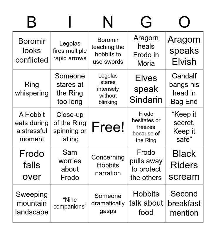 This bingo card has a free space and 70 words: “A wizard is never late”, “Keep it secret. Keep it safe”, “You shall not pass”, “I will take the Ring”, “Nine companions”, Aragorn appears in the shadows at Bree, Aragorn heals Frodo in Moria, Aragorn receives the Evenstar from Arwen, Aragorn speaks Elvish, Bilbo writing in his book after the party, Black Riders scream, Boromir encourages Merry and Pippin in battle, Boromir looks conflicted, Boromir teaching the hobbits to use swords, Celeborn meets the Fellowship, Close-up of the Ring spinning or falling, Concerning Hobbits narration, Elves speak Sindarin, Fellowship walking montage, Frodo falls over, Frodo hesitates or freezes because of the Ring, Frodo pulls away to protect the others, Gandalf bangs his head in Bag End, Gandalf gives a stern look, Gandalf laughs loudly, Gandalf uses his staff to make light, Gifts from Galadriel (Lórien), Gimli boasts about Dwarves, Hobbits talk about food, Large river scenery shot, Legolas fires multiple rapid arrows, Lembas bread introduction, Lothlórien appears glowing and ethereal, Merry and Pippin steal something, Midgewater Marshes insect scene, Mirror of Galadriel scene, Nazgûl horse sniffs for the Ring, Orcs shout or snarl, Pippin touches something he shouldn’t, Ring whispering, Sam recites the poem about Gil-galad, Sam worries about Frodo, Second breakfast mention, Someone falls during running or fighting, Someone smokes a pipe, Someone stares at the Ring too long, Sweeping mountain landscape, The Ring tempts someone, Walking montage, Wide shot of the Shire landscapes, Frodo just stares dramatically into space, Sam says “Mr. Frodo”, Pippin asks a question at the worst time, Gandalf does a dramatic cloak swirl, Someone dramatically gasps, Aragorn broods while looking into the distance, Legolas stares intensely without blinking, Gimli swings his axe and misses, Boromir gets a bit too excited about something, The camera zooms too close to the Ring, A Hobbit eats during a stressful moment, Someone slips or trips while running, Frodo breathes loudly while hiding, Elves move slowly and elegantly, Someone dramatically whispers “Frodo”, Hobbit eyes go very wide, Someone says “The Shire”, A character looks confused but determined, Close-up of hairy Hobbit feet and Someone drops something they shouldn’t.