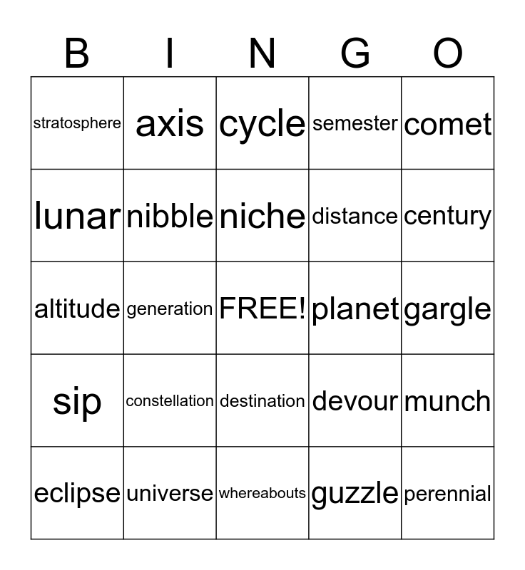 This bingo card has a free space and 24 words: constellation, universe, niche, eclipse, comet, stratosphere, lunar, axis, planet, destination, distance, altitude, devour, munch, nibble, guzzle, gargle, cycle, century, generation, perennial, sip, semester and whereabouts.