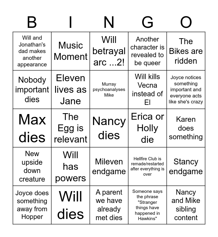 This bingo card has 25 words: Will has powers, A parent we have already met dies, Murray psychoanalyses Mike, Joyce does something away from Hopper, The Bikes are ridden, Will and Jonathan's dad makes another appearance, Nobody important dies, Music Moment, Erica or Holly die, Mileven endgame, Will kills Vecna instead of El, Max dies, Hellfire Club is remade/restarted after everything is over, Stancy endgame, Eleven lives as Jane, Nancy and Mike sibling content, Karen does something, Will betrayal arc ...2!, Joyce notices something important and everyone acts like she's crazy, The Egg is relevant, Nancy dies, Will dies, New upside down creature, Another character is revealed to be queer and Someone says the phrase "Stranger things have happened in Hawkins".