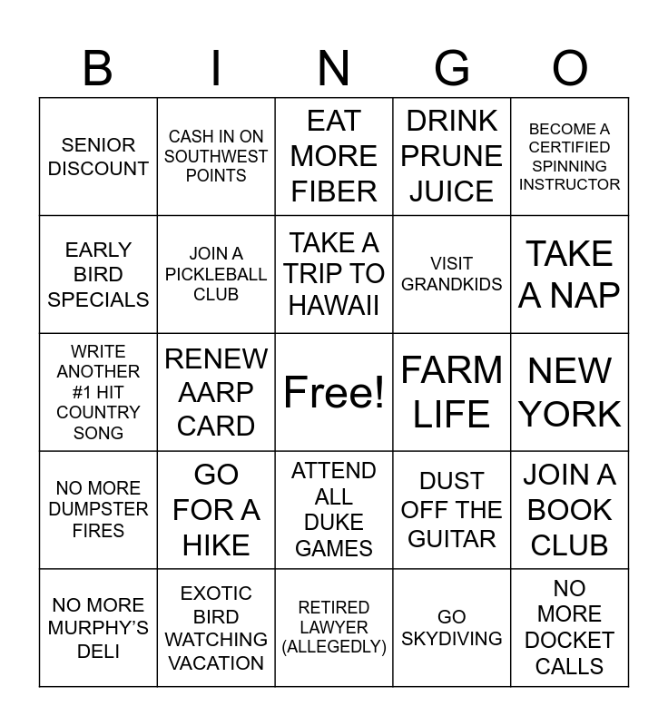 This bingo card has a free space and 24 words: GO FOR A HIKE, EXOTIC BIRD WATCHING VACATION, TAKE A TRIP TO HAWAII, NO MORE MURPHY’S DELI, BECOME A CERTIFIED SPINNING INSTRUCTOR, SENIOR DISCOUNT, EARLY BIRD SPECIALS, CASH IN ON SOUTHWEST POINTS, FARM LIFE, ATTEND ALL DUKE GAMES, VISIT GRANDKIDS, WRITE ANOTHER #1 HIT COUNTRY SONG, DUST OFF THE GUITAR, JOIN A BOOK CLUB, JOIN A PICKLEBALL CLUB, GO SKYDIVING, NEW YORK, EAT MORE FIBER, TAKE A NAP, RENEW AARP CARD, NO MORE DOCKET CALLS, NO MORE DUMPSTER FIRES, DRINK PRUNE JUICE and RETIRED LAWYER (ALLEGEDLY).