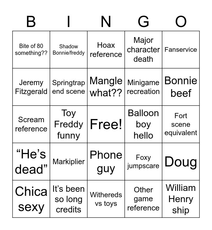 This bingo card has a free space and 24 words: Markiplier, It’s been so long credits, Mangle what??, Chica sexy, Fanservice, Bite of 80 something??, Jeremy Fitzgerald, Shadow Bonnie/freddy, Balloon boy hello, Phone guy, Minigame recreation, Scream reference, Foxy jumpscare, Doug, Springtrap end scene, Other game reference, Fort scene equivalent, Hoax reference, Bonnie beef, Toy Freddy funny, William Henry ship, “He’s dead”, Major character death and Withereds vs toys.