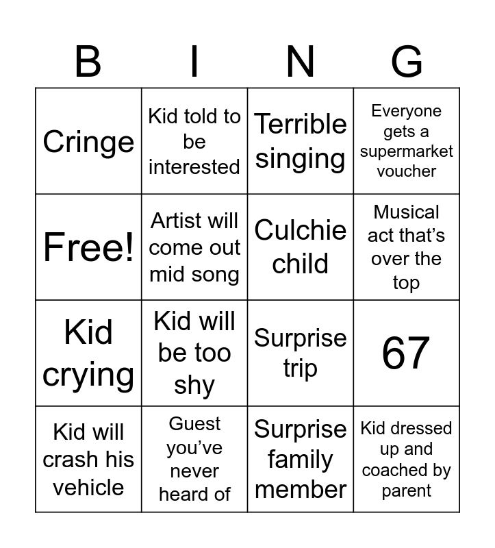 This bingo card has 16 words: Guest you’ve never heard of, 67, Terrible singing, Cringe, Kid crying, Kid told to be interested, Surprise trip, Surprise family member, Free!, Artist will come out mid song, Kid will crash his vehicle, Everyone gets a supermarket voucher, Kid will be too shy, Musical act that’s over the top, Culchie child and Kid dressed up and coached by parent.