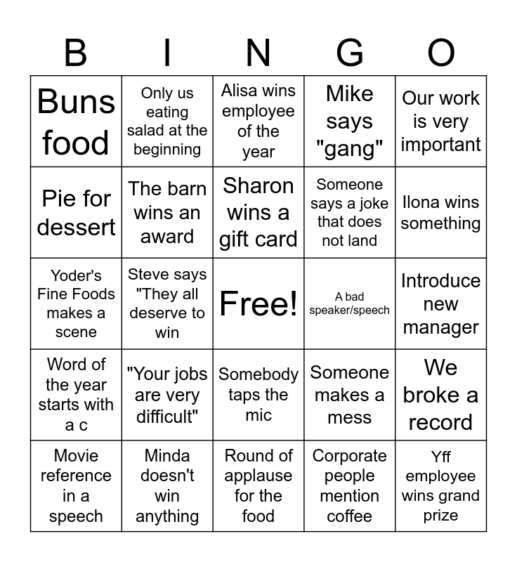 This bingo card has a free space and 24 words: "Your jobs are very difficult", Minda doesn't win anything, Sharon wins a gift card, Movie reference in a speech, Our work is very important, Buns food, Pie for dessert, Only us eating salad at the beginning, A bad speaker/speech, Somebody taps the mic, Someone says a joke that does not land, Yoder's Fine Foods makes a scene, Someone makes a mess, We broke a record, The barn wins an award, Corporate people mention coffee, Introduce new manager, Alisa wins employee of the year, Ilona wins something, Steve says "They all deserve to win, Yff employee wins grand prize, Word of the year starts with a c, Mike says "gang" and Round of applause for the food.