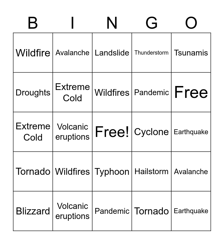 This bingo card has a free space and 43 words: Hurricane, Earthquake, Flood, Blizzard, Hailstorm, Tornado, Landslide, Avalanche, Tsunamis, Volcanic eruptions, Thunderstorm, Cyclone, Typhoon, Wildfires, Droughts, Pandemic, Extreme Heat, Extreme Cold, Tornado, Free, Avalanche, Hailstorm, Landslide, Wildfire, Hurricane, Earthquake, Flood, Blizzard, Hailstorm, Tornado, Landslide, Avalanche, Tsunamis, Volcanic eruptions, Thunderstorm, Cyclone, Typhoon, Wildfires, Droughts, Pandemic, Extreme Heat, Extreme Cold and Famine.