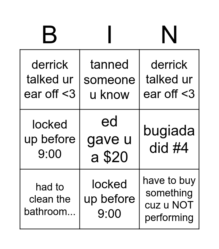 ⚠ This card has duplicate items: derrick talked ur ear off <3 (2), locked up before 9:00 (2)