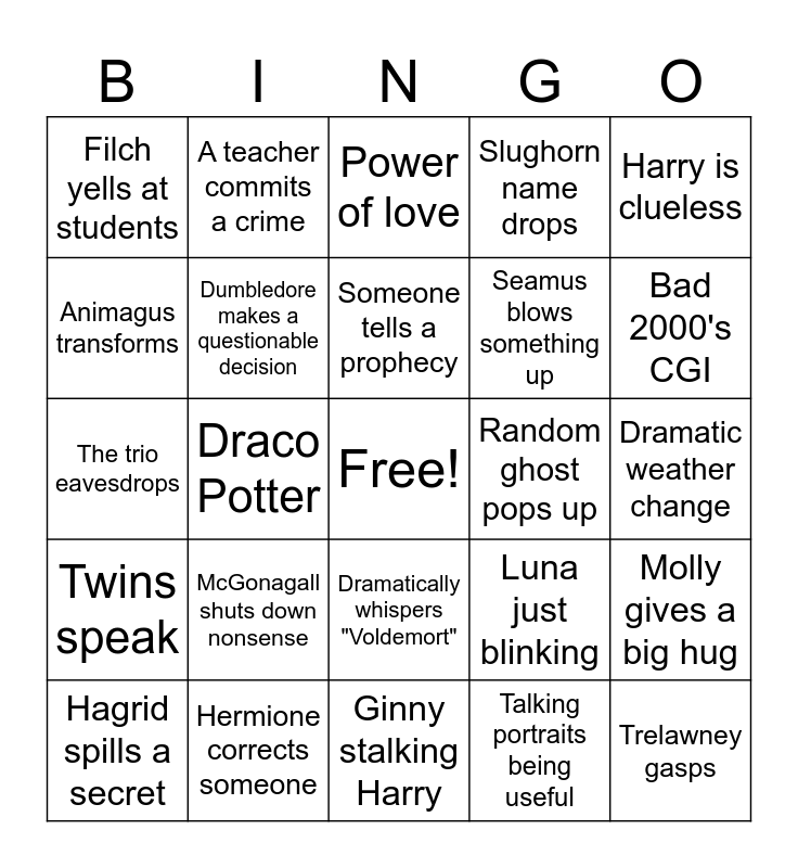 This bingo card has a free space and 33 words: Ron eats way too much, Harry mom/dad, Draco Potter, Snape insults, Twins speak, Dumbledore makes a questionable decision, Harry is clueless, Hagrid spills a secret, A teacher commits a crime, Hermione goes on a tangent, Someone tells a prophecy, Power of love, Neville is having a bad time, Doing homework, Random ghost pops up, Bad 2000's CGI, Hermione corrects someone, The trio eavesdrops, McGonagall shuts down nonsense, Luna just blinking, Dramatically whispers "Voldemort", Hagrid swears something is safe, Filch yells at students, Dramatic weather change, Ginny stalking Harry, Trelawney gasps, Slughorn name drops, Seamus blows something up, Animagus transforms, Molly gives a big hug, Dobby punishes himself, Talking portraits being useful and Dumbledore answers in a riddle.