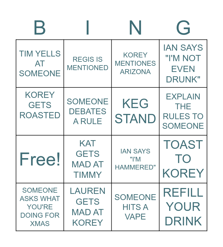 This bingo card has 20 words: TOAST TO KOREY, TAKE A SHOT, KOREY MENTIONES ARIZONA, 5 SECOND CHUG, SOMEONE ASKS WHAT YOU'RE DOING FOR XMAS, KOREY GETS ROASTED, LAUREN GETS MAD AT KOREY, TIM YELLS AT SOMEONE, Free!, REGIS IS MENTIONED, KAT GETS MAD AT TIMMY, IAN SAYS "I'M HAMMERED", SOMEONE DEBATES A RULE, REFILL YOUR DRINK, KEG STAND, JACK FLIPS SOMEBODY OFF, EXPLAIN THE RULES TO SOMEONE, IAN SAYS "I'M NOT EVEN DRUNK", SOMEONE HITS A VAPE and KOREY ASKS FOR YOUR ZYNS.