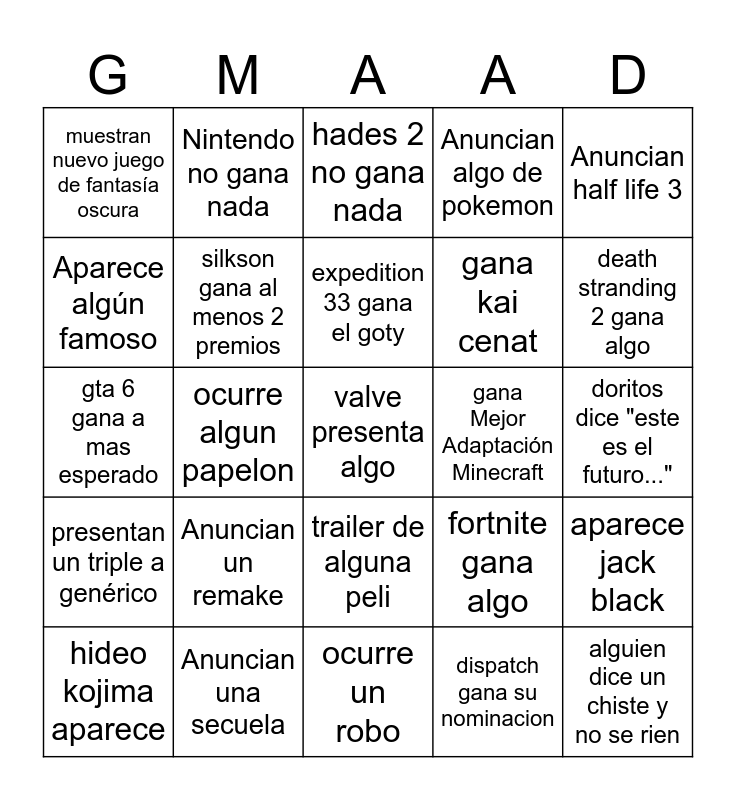 This bingo card has a free space and 24 words: Anuncian un remake, Anuncian una secuela, expedition 33 gana el goty, hideo kojima aparece, Anuncian half life 3, muestran nuevo juego de fantasía oscura, Aparece algún famoso, Nintendo no gana nada, gana Mejor Adaptación Minecraft, trailer de alguna peli, gana kai cenat, gta 6 gana a mas esperado, fortnite gana algo, aparece jack black, silkson gana al menos 2 premios, dispatch gana su nominacion, doritos dice "este es el futuro...", hades 2 no gana nada, death stranding 2 gana algo, ocurre algun papelon, alguien dice un chiste y no se rien, presentan un triple a genérico, Anuncian algo de pokemon and ocurre un robo.