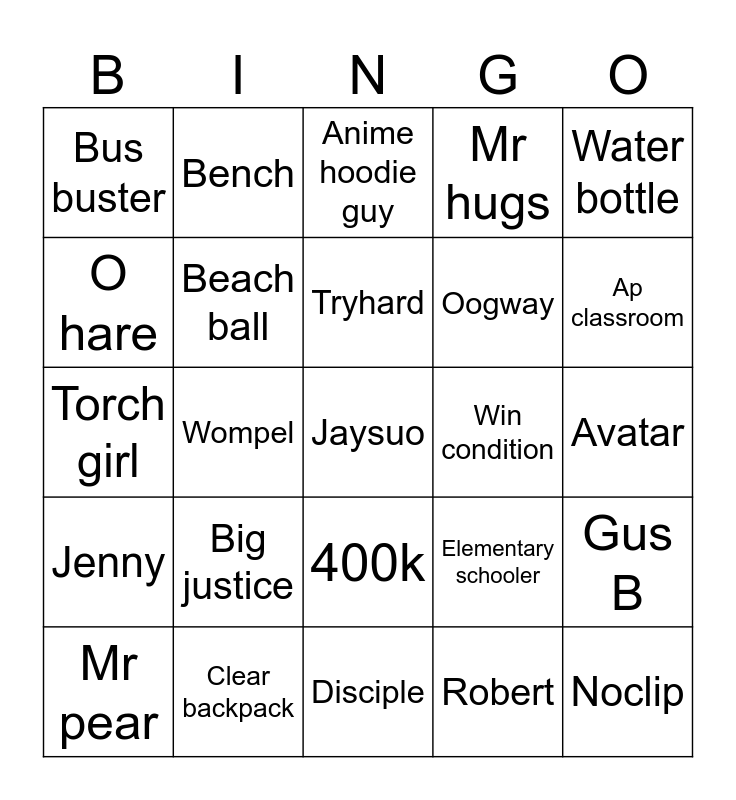This bingo card has a free space and 29 words: Mr pear, His guns, Wompel, Geeked guy, Bus buster, Anime hoodie guy, Beach ball, Big justice, Win condition, Clear backpack, Avatar, Noclip, Disciple, Robert, Ap classroom, 1., 400k, Jenny, Water bottle, Torch girl, Elementary schooler, Mumen rider, Oogway, O hare, Mr hugs, Bench, Gus B, Tryhard and Pickaxe.