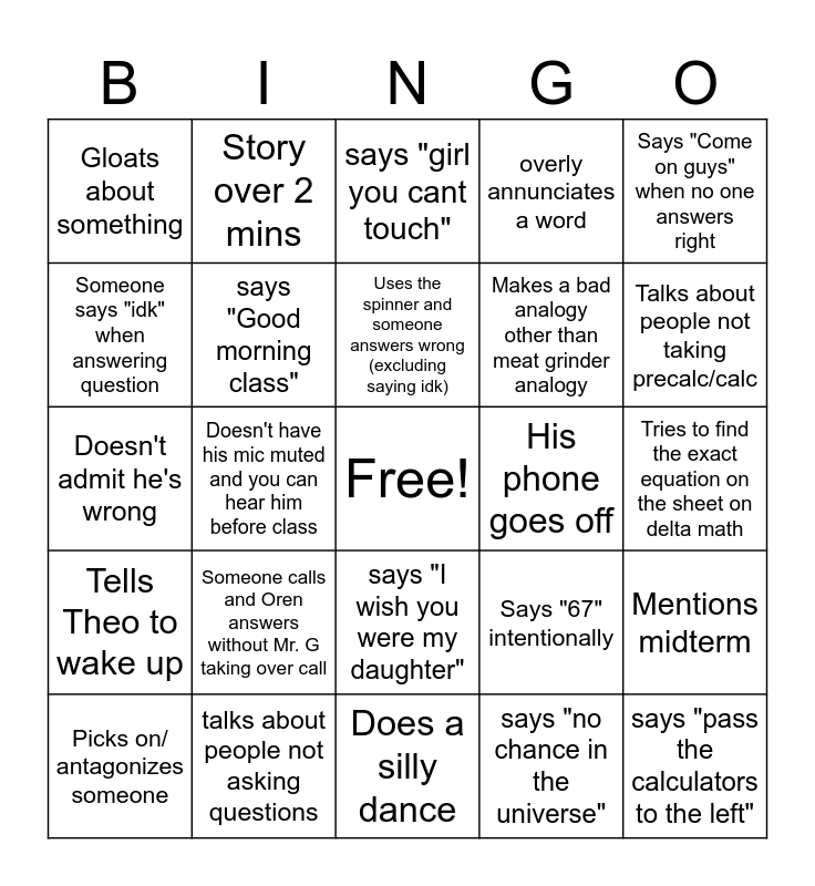 This bingo card has a free space and 39 words: Makes meat grinder analogy, Says something generally inapropriate, represents a graph with his arms and body, says "Good morning class", Picks on/ antagonizes someone, says "I wish you were my daughter", Uses the spinner and someone answers wrong (excluding saying idk), Uses the spinner and someone answers right, Says "Come on guys" when no one answers right, Tells Theo to wake up, Doesn't have his mic muted and you can hear him before class, overly annunciates a word, says "pass the calculators to the left", Tries to find the exact equation on the sheet on delta math, His phone goes off, Someone calls and Oren answers without Mr. G taking over call, Someone calls the phone and he uses his earbud thing, Gloats about something, Talks about Russia or speaking Russian, Says "67" intentionally, Someone says "idk" when answering question, Does a silly dance, Makes a bad analogy other than meat grinder analogy, Talks about people not taking precalc/calc, Does a deep sigh, Stays quiet for 1 min straight, equation has 67 in it and he doesn't realize, Pass calculator alarm interrupts him mid sentence, Says "your distracting me", Story over 2 mins, Says "literly", Raises voice to make the math sound more important, says "girl you cant touch", talks about people not asking questions, says "no chance in the universe", On another periods sheet/ starts on wrong question, Mentions midterm, Doesn't admit he's wrong and Someone cuts him off and answers the question.