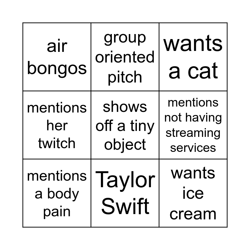 This bingo card has 18 words: “GUUUYS!”, “Brittney has a baby”, wants a cat, air bongos, glazed-eyed food names, mentions her twitch, Lady Bug and Cat Noir, group oriented pitch, Taylor Swift, wants ice cream, uses a voice, shows off a tiny object, talks about her dad, mentions not having streaming services, mentions a body pain, irrational thought interjection, work/student story and “check out my[…]”.