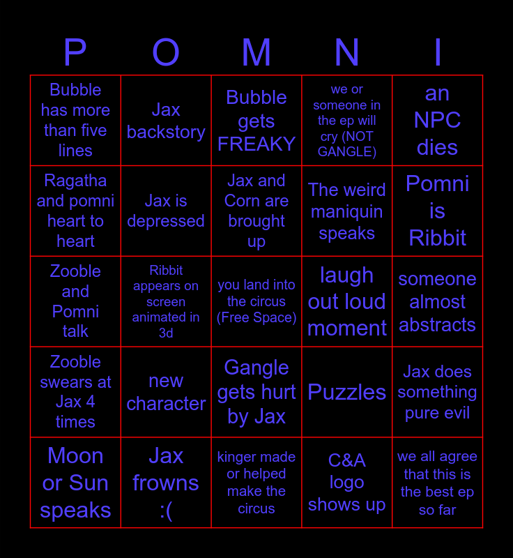 This bingo card has a free space and 44 words: someone abstracts, we all agree that this is the best ep so far, WE PREDICT WHAT HAPPENS!, Moon or Sun speaks, Caine goes crazy!, C&A logo shows up, Bubble gets FREAKY, Pomni and Ragatha are friends again, an NPC dies, Jax frowns :(, we or someone in the ep will cry (NOT GANGLE), laugh out loud moment, Gangle gets hurt by Jax, new character, theme song returns, kinger made or helped make the circus, Kinger see's a BUG, Zooble and Pomni talk, gummy goo returns?, Pomni is Ribbit, Jax backstory, Musical number, ends on a cliff hanger, Bubble has more than five lines, Glonk queen cameo, someone almost abstracts, Pogger's (unexpected twist), reference to previous ep, Puzzles, Zooble swears at Jax 4 times, flash back!, Jax does something pure evil, Ragatha crashes out, art style changes, Ribbit appears on screen animated in 3d, Pomni says a swear, Zooble has a heart to heart with Gangle, Kouphmo appears in 3d animation, Jax and Corn are brought up, Ragatha and pomni heart to heart, The weird maniquin speaks, Shriiiiimp, Jax is depressed and Direct mention or reference to I have no mouth and I must scream.