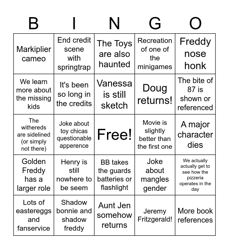 This bingo card has a free space and 24 words: Henry is still nowhere to be seem, Shadow bonnie and shadow freddy, Vanessa is still sketch, Lots of eastereggs and fanservice, Freddy nose honk, Markiplier cameo, We learn more about the missing kids, End credit scene with springtrap, Movie is slightly better than the first one, BB takes the guards batteries or flashlight, Doug returns!, The withereds are sidelined (or simply not there), Joke about mangles gender, We actually actually get to see how the pizzeria operates in the day, It's been so long in the credits, Jeremy Fritzgerald!, A major character dies, The Toys are also haunted, The bite of 87 is shown or referenced, Joke about toy chicas questionable apperence, More book references, Golden Freddy has a larger role, Recreation of one of the minigames and Aunt Jen somehow returns.