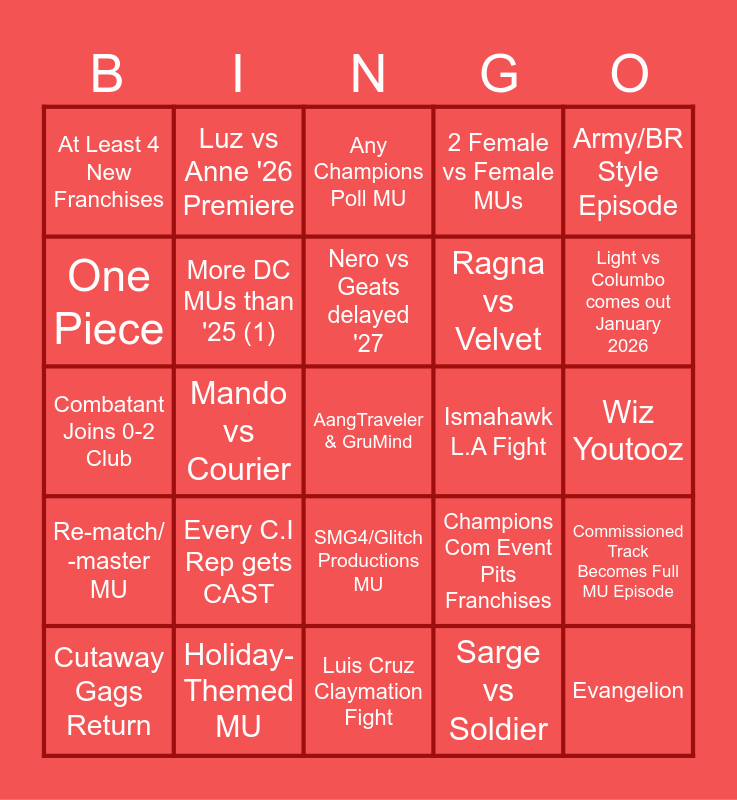 This bingo card has a free space and 24 words: Every C.I Rep gets CAST, Holiday-Themed MU, Nero vs Geats delayed '27, Cutaway Gags Return, Army/BR Style Episode, At Least 4 New Franchises, One Piece, Luz vs Anne '26 Premiere, Ismahawk L.A Fight, SMG4/Glitch Productions MU, Ragna vs Velvet, Combatant Joins 0-2 Club, Champions Com Event Pits Franchises, Commissioned Track Becomes Full MU Episode, More DC MUs than '25 (1), Sarge vs Soldier, Wiz Youtooz, Any Champions Poll MU, Light vs Columbo comes out January 2026, Mando vs Courier, Evangelion, Re-match/ -master MU, 2 Female vs Female MUs and Luis Cruz Claymation Fight.