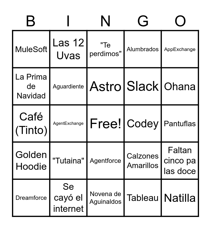 This bingo card has a free space and 48 words: Buñuelo Caliente, Natilla, Noche de Velitas, Novena de Aguinaldos, "Tutaina", El "Año Viejo", Las 12 Uvas, Sancocho de Enero, La Prima de Navidad, Lata de Galletas de navidad, Aguardiente, Alumbrados, Faltan cinco pa las doce, Calzones Amarillos, Empanada, Burrito Sabanero, Astro, Codey, Einstein, AppExchange, AgentExchange, Tableau, MuleSoft, Slack, Trailhead, Ohana, Dreamforce, Data Cloud, Agentforce, Golden Hoodie, Modelo 1-1-1, Servicios Profesionales, "Estás en Mute", "¿Ya ven mi pantalla?", Se cayó el internet, Se fue la luz, Cámara Apagada, Pantuflas, Llegó el rappi, Reunión que pudo ser un hilo en slack, "El de los aguacates", "Tengo que sacar al perro", "Te perdimos", "Hola, ¿me escuchan?", Café (Tinto), Termo de Agua, VPN and Notificación de Slack.