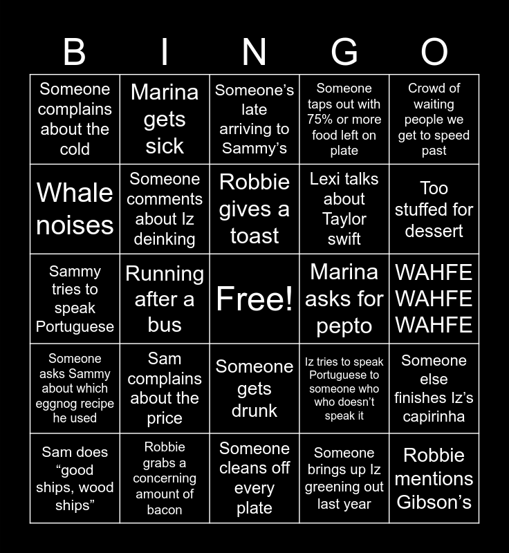 This bingo card has a free space and 24 words: Sam complains about the price, Robbie grabs a concerning amount of bacon, Robbie gives a toast, Sam does “good ships, wood ships”, Crowd of waiting people we get to speed past, Someone complains about the cold, Whale noises, Marina gets sick, Marina asks for pepto, Someone gets drunk, Lexi talks about Taylor swift, Sammy tries to speak Portuguese, Iz tries to speak Portuguese to someone who who doesn’t speak it, Someone else finishes Iz’s capirinha, Someone comments about Iz deinking, Someone brings up Iz greening out last year, WAHFE WAHFE WAHFE, Someone’s late arriving to Sammy’s, Too stuffed for dessert, Running after a bus, Robbie mentions Gibson’s, Someone asks Sammy about which eggnog recipe he used, Someone taps out with 75% or more food left on plate and Someone cleans off every plate.