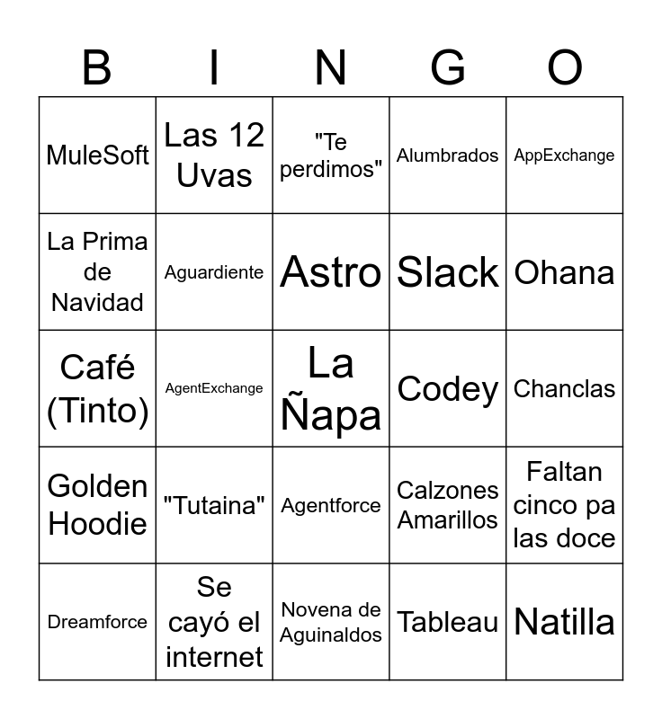 This bingo card has a free space and 48 words: Buñuelo Caliente, Natilla, Noche de Velitas, Novena de Aguinaldos, "Tutaina", El "Año Viejo", Las 12 Uvas, Sancocho de Enero, La Prima de Navidad, Lata de Galletas de navidad, Aguardiente, Alumbrados, Faltan cinco pa las doce, Calzones Amarillos, Empanada, Burrito Sabanero, Astro, Codey, Einstein, AppExchange, AgentExchange, Tableau, MuleSoft, Slack, Trailhead, Ohana, Dreamforce, Data Cloud, Agentforce, Golden Hoodie, Modelo 1-1-1, Servicios Profesionales, "Estás en Mute", "¿Ya ven mi pantalla?", Se cayó el internet, Se fue la luz, Cámara Apagada, Chanclas, Llegó el rappi, Reunión que pudo ser un hilo en slack, "El de los aguacates", "Tengo que sacar al perro", "Te perdimos", "Hola, ¿me escuchan?", Café (Tinto), Termo de Agua, VPN and Notificación de Slack.