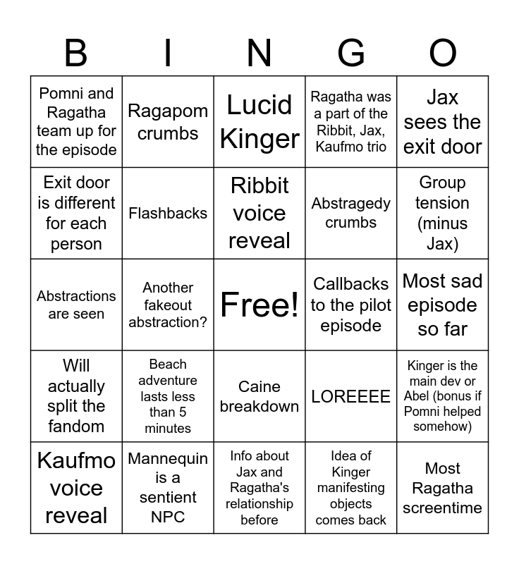 This bingo card has a free space and 24 words: Beach adventure lasts less than 5 minutes, Mannequin is a sentient NPC, Ribbit voice reveal, Kaufmo voice reveal, Jax sees the exit door, Pomni and Ragatha team up for the episode, Exit door is different for each person, Ragapom crumbs, Callbacks to the pilot episode, Caine breakdown, Abstragedy crumbs, Abstractions are seen, LOREEEE, Kinger is the main dev or Abel (bonus if Pomni helped somehow), Flashbacks, Idea of Kinger manifesting objects comes back, Most sad episode so far, Lucid Kinger, Group tension (minus Jax), Another fakeout abstraction?, Most Ragatha screentime, Will actually split the fandom, Ragatha was a part of the Ribbit, Jax, Kaufmo trio and Info about Jax and Ragatha's relationship before.