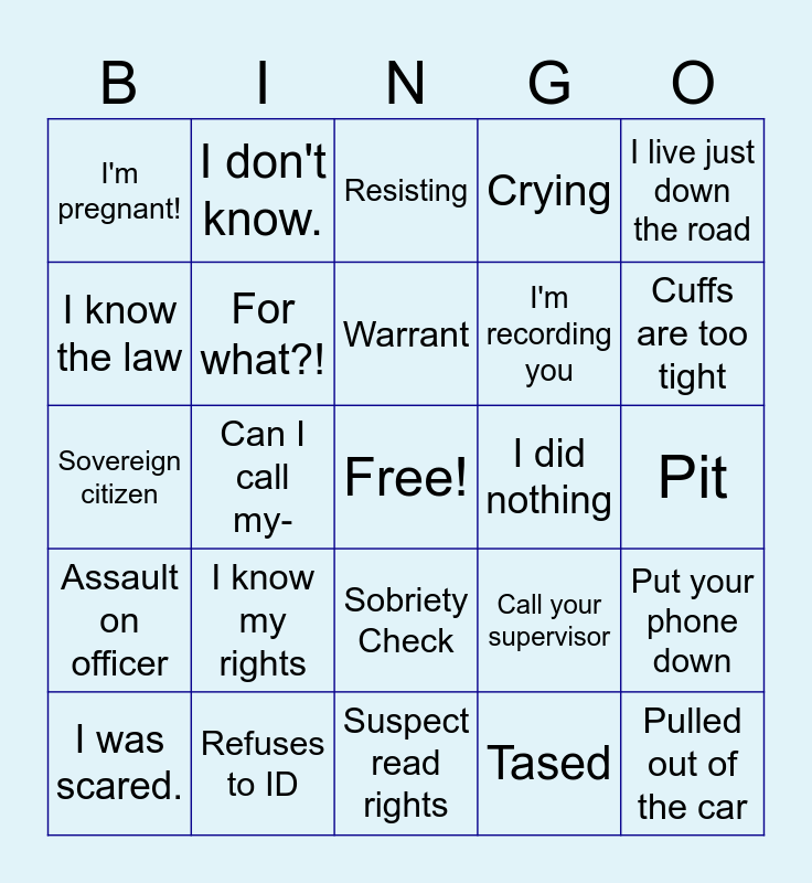 This bingo card has a free space and 24 words: I was scared., I know my rights, Warrant, Tased, I live just down the road, I'm pregnant!, I don't know., Resisting, I did nothing, Pit, Sovereign citizen, For what?!, Call your supervisor, Put your phone down, I know the law, Refuses to ID, Suspect read rights, Crying, Cuffs are too tight, Assault on officer, Can I call my-, Sobriety Check, I'm recording you and Pulled out of the car.