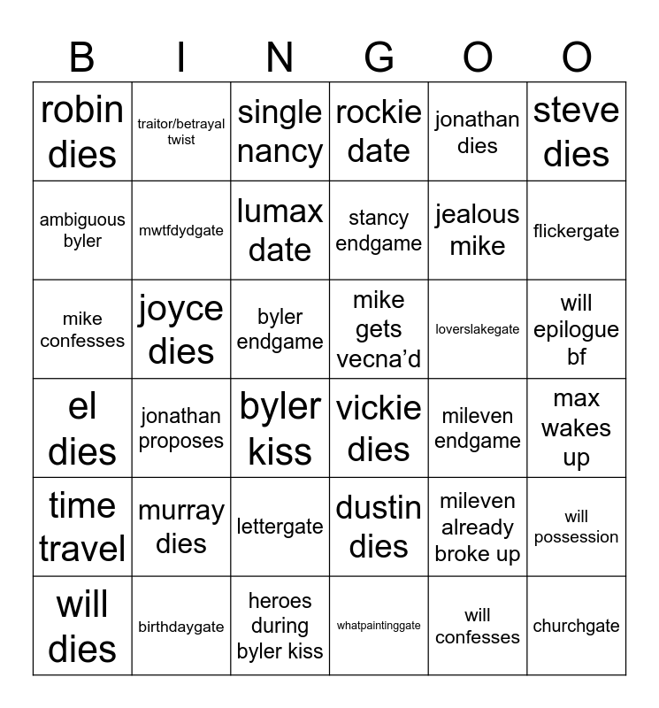This bingo card has 36 words: dustin dies, lettergate, whatpaintinggate, ambiguous byler, el dies, mike gets vecna’d, mwtfdydgate, heroes during byler kiss, jonathan dies, mileven already broke up, flickergate, rockie date, will possession, joyce dies, stancy endgame, robin dies, time travel, loverslakegate, mike confesses, single nancy, byler endgame, jonathan proposes, vickie dies, byler kiss, mileven endgame, traitor/betrayal twist, jealous mike, birthdaygate, lumax date, steve dies, churchgate, will dies, max wakes up, will epilogue bf, murray dies and will confesses.