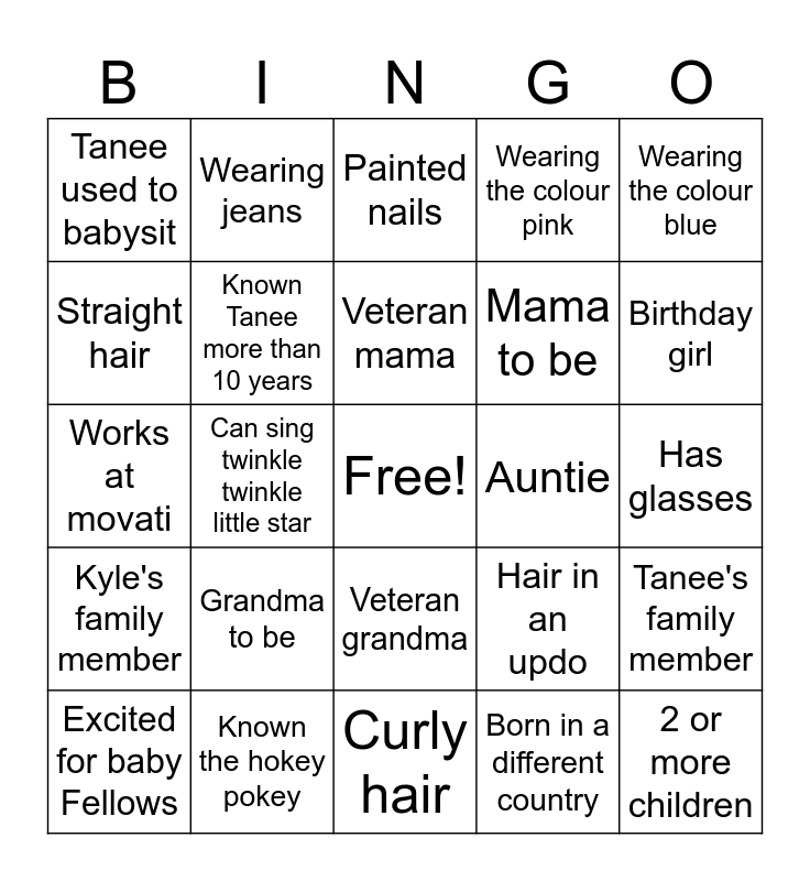 This bingo card has a free space and 24 words: Grandma to be, Known the hokey pokey, Veteran mama, Excited for baby Fellows, Wearing the colour blue, Tanee used to babysit, Straight hair, Wearing jeans, Auntie, Veteran grandma, Mama to be, Works at movati, Hair in an updo, Tanee's family member, Known Tanee more than 10 years, Born in a different country, Has glasses, Painted nails, Birthday girl, Can sing twinkle twinkle little star, 2 or more children, Kyle's family member, Wearing the colour pink and Curly hair.