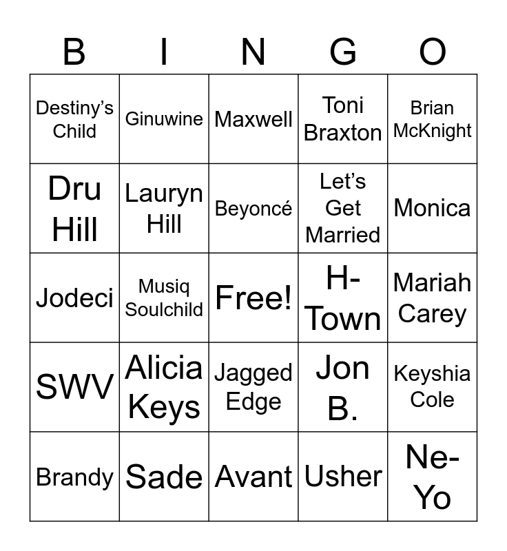This bingo card has a free space and 25 words: Alicia Keys, Avant, Beyoncé, Brandy, Brian McKnight, Destiny’s Child, Dru Hill, Ginuwine, H-Town, Jagged Edge, Let’s Get Married, Jodeci, Jon B., Keyshia Cole, Lauryn Hill, LL Cool J, Mariah Carey, Maxwell, Monica, Musiq Soulchild, Ne-Yo, Sade, SWV, Toni Braxton and Usher.