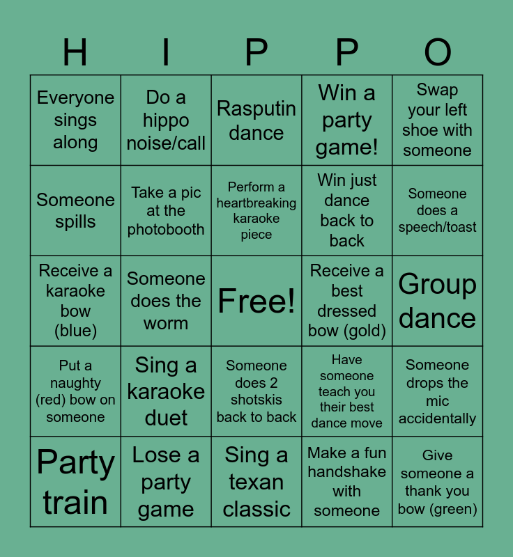 This bingo card has a free space and 24 words: Sing a karaoke duet, Lose a party game, Perform a heartbreaking karaoke piece, Party train, Swap your left shoe with someone, Everyone sings along, Someone spills, Do a hippo noise/call, Receive a best dressed bow (gold), Someone does 2 shotskis back to back, Win just dance back to back, Receive a karaoke bow (blue), Have someone teach you their best dance move, Someone drops the mic accidentally, Take a pic at the photobooth, Make a fun handshake with someone, Group dance, Rasputin dance, Someone does a speech/toast, Someone does the worm, Give someone a thank you bow (green), Put a naughty (red) bow on someone, Win a party game! and Sing a texan classic.