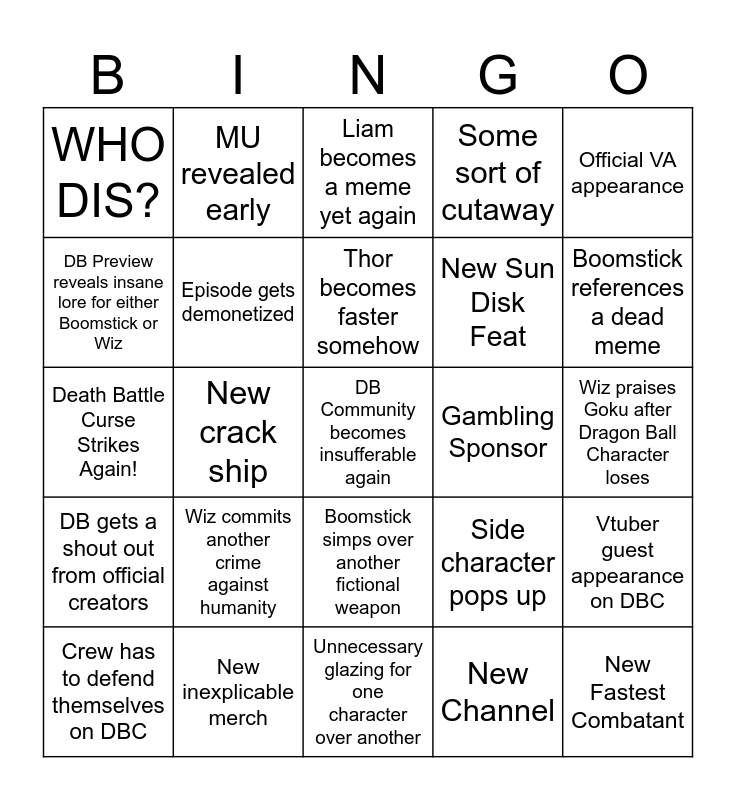 This bingo card has a free space and 24 words: Wiz commits another crime against humanity, New inexplicable merch, Thor becomes faster somehow, Crew has to defend themselves on DBC, Official VA appearance, WHO DIS?, DB Preview reveals insane lore for either Boomstick or Wiz, MU revealed early, Gambling Sponsor, Boomstick simps over another fictional weapon, New Sun Disk Feat, Death Battle Curse Strikes Again!, Side character pops up, Vtuber guest appearance on DBC, Episode gets demonetized, New Channel, Wiz praises Goku after Dragon Ball Character loses, Liam becomes a meme yet again, Boomstick references a dead meme, New crack ship, New Fastest Combatant, DB gets a shout out from official creators, Some sort of cutaway and Unnecessary glazing for one character over another.