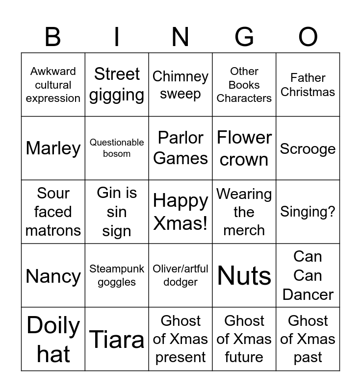 This bingo card has a free space and 29 words: Doily hat, Ringlets, Gin is sin sign, Drunk, Awkward cultural expression, Chimney sweep, Questionable bosom, Steampunk goggles, Wearing the merch, Tiara, Singing?, Ghost of Xmas past, Ghost of Xmas present, Ghost of Xmas future, Scrooge, Dickens, Oliver/artful dodger, Nancy, Father Christmas, Sour faced matrons, Nuts, Ugly hoop, Flower crown, Marley, Other Books Characters, Street gigging, Can Can Dancer, Parlor Games and Amazon Felt Bonnet.