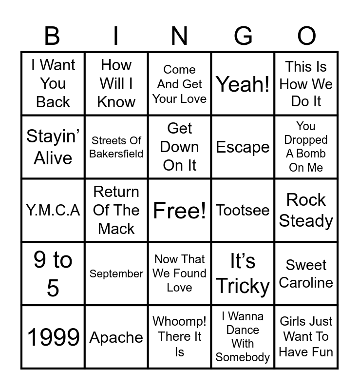 This bingo card has a free space and 42 words: Let’s Groove, Get Down On It, Celebration, September, I Wanna Dance With Somebody, Sweet Caroline, Girls Just Want To Have Fun, She’s A Bad Mama Jama, Come And Get Your Love, Now That We Found Love, Rock Steady, You Dropped A Bomb On Me, Return Of The Mack, This Is How We Do It, Let It Whip, It’s Tricky, I Will Survive, Y.M.C.A, Let’s Get It Started, How Will I Know, Stayin’ Alive, Got To Be Real, Respect, I Want You Back, Everybody, Just Dance, Escape, It Takes Two, Shake It Off, Tennessee Whiskey, P.Y.T., 9 to 5, Streets Of Bakersfield, Whoomp! There It Is, Ain’t No Mountain High Enough, 1999, Apache, Tootsee, Super Freak, Ice Ice Baby, Yeah! and Cupid Shuffle.