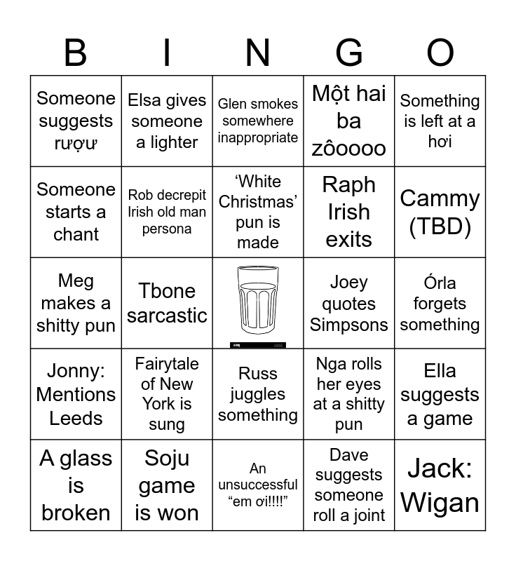 This bingo card has a free space and 24 words: Fairytale of New York is sung, Soju game is won, ‘White Christmas’ pun is made, A glass is broken, Something is left at a hơi, Someone suggests rượư, Someone starts a chant, Elsa gives someone a lighter, Joey quotes Simpsons, Russ juggles something, Raph Irish exits, Meg makes a shitty pun, Nga rolls her eyes at a shitty pun, Ella suggests a game, Rob decrepit Irish old man persona, Dave suggests someone roll a joint, Órla forgets something, Glen smokes somewhere inappropriate, Cammy (TBD), Tbone sarcastic, Jack: Wigan, Jonny: Mentions Leeds, Một hai ba zôoooo and An unsuccessful “em ơi!!!!”.