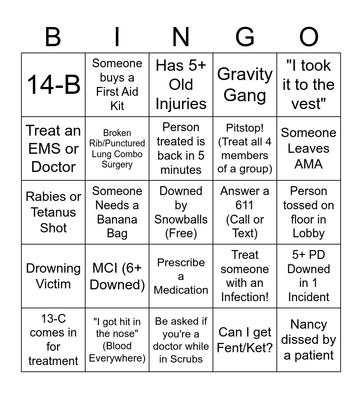 This bingo card has a free space and 24 words: MCI (6+ Downed), "I got hit in the nose" (Blood Everywhere), Person treated is back in 5 minutes, 13-C comes in for treatment, "I took it to the vest", 14-B, Treat an EMS or Doctor, Someone buys a First Aid Kit, Answer a 611 (Call or Text), Prescribe a Medication, Pitstop! (Treat all 4 members of a group), Rabies or Tetanus Shot, Treat someone with an Infection!, 5+ PD Downed in 1 Incident, Broken Rib/Punctured Lung Combo Surgery, Can I get Fent/Ket?, Person tossed on floor in Lobby, Has 5+ Old Injuries, Someone Leaves AMA, Someone Needs a Banana Bag, Nancy dissed by a patient, Drowning Victim, Gravity Gang and Be asked if you're a doctor while in Scrubs.