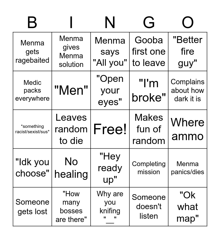 This bingo card has a free space and 24 words: No healing, "How many bosses are there", "Open your eyes", Someone gets lost, "Better fire guy", Menma gets ragebaited, Medic packs everywhere, Menma gives Menma solution, Makes fun of random, "Hey ready up", "I'm broke", *something racist/sexist/sus*, Completing mission, Menma panics/dies, "Men", Someone doesn't listen, Where ammo, Menma says "All you", Complains about how dark it is, Leaves random to die, "Ok what map", "Idk you choose", Gooba first one to leave and Why are you knifing "__".