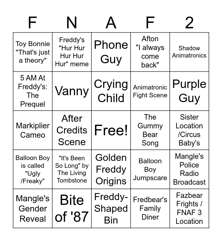 This bingo card has a free space and 24 words: "It's Been So Long" by The Living Tombstone, Bite of '87, Crying Child, Mangle's Gender Reveal, Shadow Animatronics, Toy Bonnie "That's just a theory", 5 AM At Freddy's: The Prequel, Freddy's "Hur Hur Hur Hur Hur" meme, The Gummy Bear Song, Golden Freddy Origins, Animatronic Fight Scene, Markiplier Cameo, Balloon Boy Jumpscare, Mangle's Police Radio Broadcast, Vanny, Fredbear's Family Diner, Sister Location /Circus Baby's, Phone Guy, Purple Guy, After Credits Scene, Fazbear Frights / FNAF 3 Location, Balloon Boy is called "Ugly /Freaky", Afton "I always come back" and Freddy-Shaped Bin.