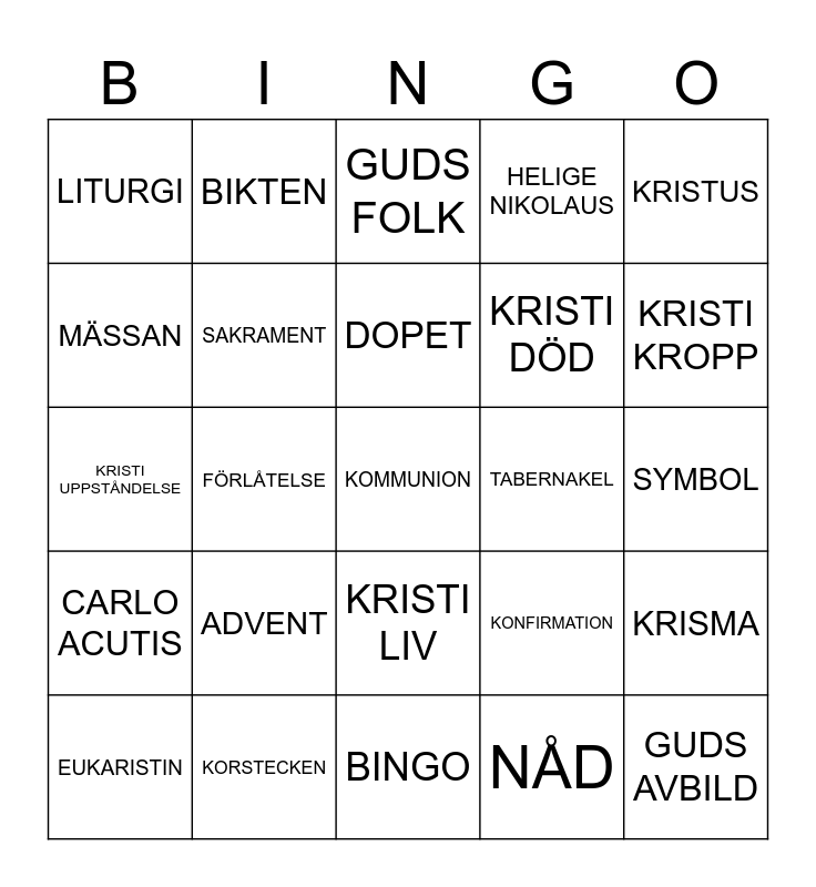 This bingo card has a free space and 24 words: ADVENT, KORSTECKEN, DOPET, EUKARISTIN, KRISTUS, LITURGI, MÄSSAN, BIKTEN, TABERNAKEL, KRISTI LIV, KRISTI DÖD, KRISTI UPPSTÅNDELSE, KONFIRMATION, KRISMA, SAKRAMENT, NÅD, SYMBOL, GUDS FOLK, KRISTI KROPP, FÖRLÅTELSE, GUDS AVBILD, CARLO ACUTIS, HELIGE NIKOLAUS and BINGO.