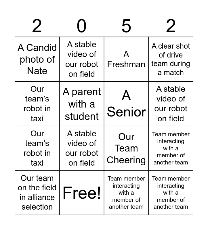This bingo card has 21 words: Free!, A clear shot of drive team during a match, A stable video of our robot on field, Portrait of someone in uniform, Team member interacting with a member of another team, A Senior, A Candid photo of Nate, A Freshman, Our Team Cheering, A stable video of our robot on field, Our team’s robot in taxi, A clear shot of drive team during a match, Team member interacting with a member of another team, Drive team celebrating a win, A parent with a student, A Junior, Our team on the field in alliance selection, A stable video of our robot on field, Our team’s robot in taxi, Team member interacting with a member of another team and A Sophomore.