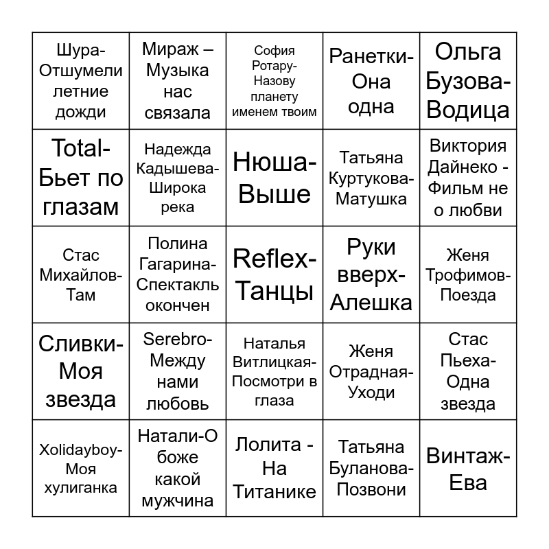 This bingo card has 40 words: Free!, Стас Михайлов- Там, Надежда Кадышева- Плывет веночек, Надежда Кадышева- Широка река, Натали-О боже какой мужчина, Наталья Витлицкая- Посмотри в глаза, Нюша- Выше, Олег Газманов- Мои ясные дни, Ольга Бузова- Водица, Сливки-Моя звезда, Полина Гагарина- Спектакль окончен, Ранетки-Она одна, Reflex-Танцы, Женя Трофимов- Поезда, Руки вверх- Алешка, Serebro-Между нами любовь, Сергей Лазарев- Вкус малины, Шура- Отшумели летние дожди, Слава-Одиночество, София Ротару- Назову планету именем твоим, Стас Пьеха- Одна звезда, Татьяна Буланова- Позвони, Татьяна Куртукова- Матушка, Total-Бьет по глазам, Валерия- Часики, Валерий Меладзе- Салют Вера, Чи-ли - Лето, Виагра- Не оставляй меня любимый, Винтаж- Ева, Винтаж- Знак водолея, Дискотека Авария – Малинки-малинки, Xolidayboy- Моя хулиганка, Жанна Фриске- А на море белый песок, Женя Отрадная- Уходи, Виктория Дайнеко - Фильм не о любви, Лолита - На Титанике, Полина Гагарина – Обезоружена, Сергей Лазарев- Снег в океане, Мираж – Музыка нас связала and Король и шут- Прыгну со скалы.